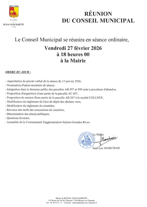 CONSEIL MUNICIPAL LE 27 FEVRIER 2026 Nous portons à votre connaissance l’ordre du jour du prochain conseil municipal qui se réunira le 27 février 2026 à 18h en mairie. Francoise2026-02-13T12:05:45+01:0013 février 2026|A la une, Actu| Partager cet article FacebookXRedditLinkedInTumblrPinterestVkEmail Articles similaires FERMETURE DE LA DECHETTERIE SAINTES NORD Galerie FERMETURE DE LA DECHETTERIE SAINTES NORD COMMISSION DE CONTRÔLE DES LISTES ELECTORALES Galerie COMMISSION DE CONTRÔLE DES LISTES ELECTORALES LOTO DE LA RANDO LE 8 MARS 2026 Galerie LOTO DE LA RANDO LE 8 MARS 2026 FLASH INFO JANVIER 2026 Galerie FLASH INFO JANVIER 2026 MIGRATION DES CRAPAUDS A L’ESCAMBOUILLE Galerie MIGRATION DES CRAPAUDS A L’ESCAMBOUILLE