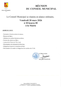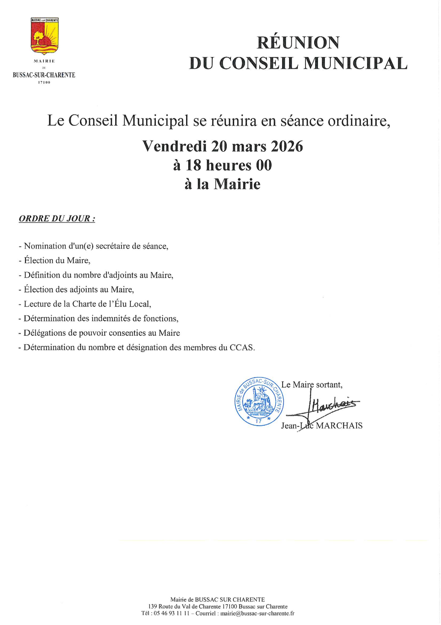 ORDRE DU JOUR DU PROCHAIN CONSEIL MUNICIPAL Nous portons à votre connaissance l’ordre du jour du prochain conseil municipal qui se réunira le vendredi 20 mars 2026 à 18h00 en mairie. Francoise2026-03-16T12:36:08+01:0016 mars 2026|A la une, Actu| Partager cet article FacebookXRedditLinkedInTumblrPinterestVkEmail Articles similaires RESULTATS DES ELECTIONS MUNICIPALES A BUSSAC Galerie RESULTATS DES ELECTIONS MUNICIPALES A BUSSAC INFOS ELECTIONS MUNICIPALES Galerie INFOS ELECTIONS MUNICIPALES DELIBERATIONS DU CONSEIL MUNICIPAL DU 27 FEVRIER 2026 Galerie DELIBERATIONS DU CONSEIL MUNICIPAL DU 27 FEVRIER 2026 DETRUIRE LES NIDS ET PIEGER LES FRELONS ! Galerie DETRUIRE LES NIDS ET PIEGER LES FRELONS ! COLLECTE DES ENCOMBRANTS SUITE AUX INONDATIONS Galerie COLLECTE DES ENCOMBRANTS SUITE AUX INONDATIONS